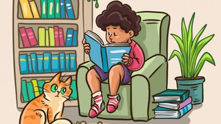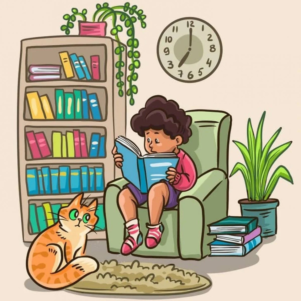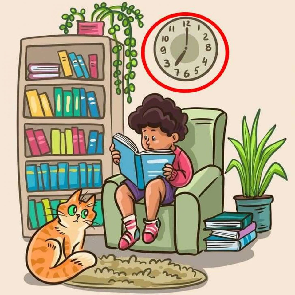 Одна з таких задач пропонує глядачеві знайти помилку на ілюстрації. На малюнку зображений хлопчик у кріслі з книжкою та кіт, що спостерігає за ним.