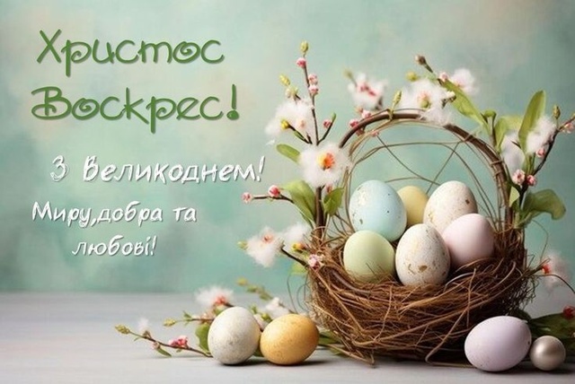 Хай велике свято Христового Воскресіння зайде до Вас з дарами Миру й Перемоги! Щоб ваші серця наповнювалися спокоєм, а душа радістю про щасливе сьогодення!