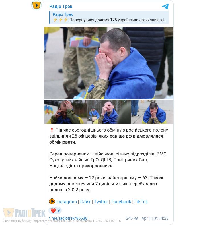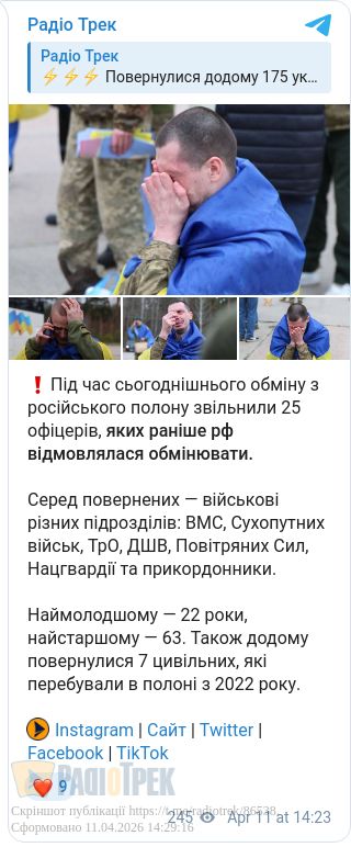 За його словами, серед звільнених — 175 військовослужбовців Збройних Сил України, Національної гвардії та прикордонної служби, а також 7 цивільних осіб.