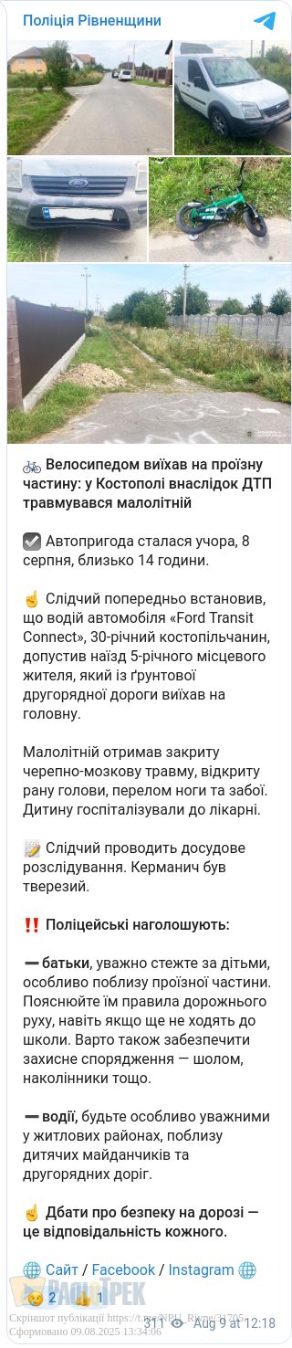 Слідчий попередньо встановив, що водій автомобіля «Ford Transit Connect», 30-річний костопільчанин, збив 5-річного хлопчика, який із ґрунтової другорядної дороги виїхав на головну.