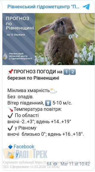Завтра, 12 березня, у Рівному та області очікується мінлива хмарність.