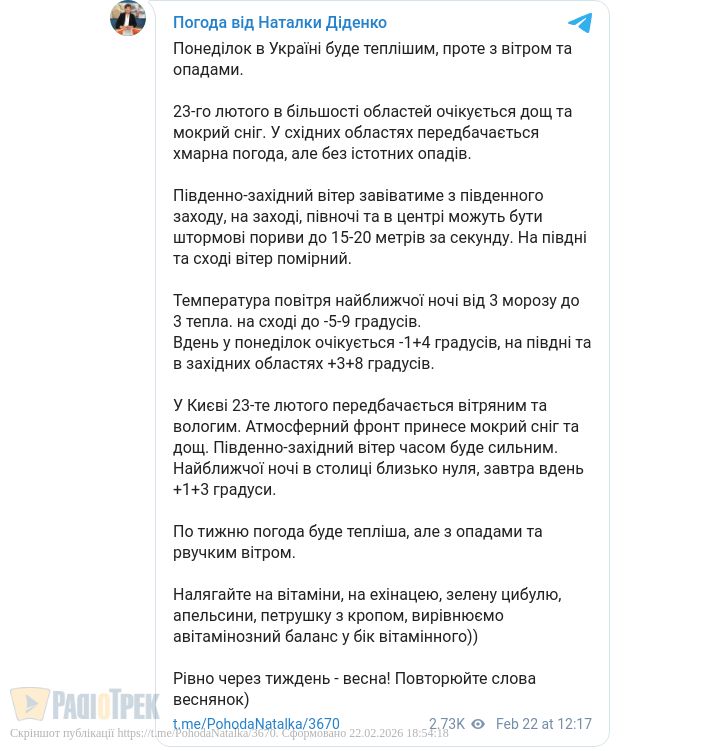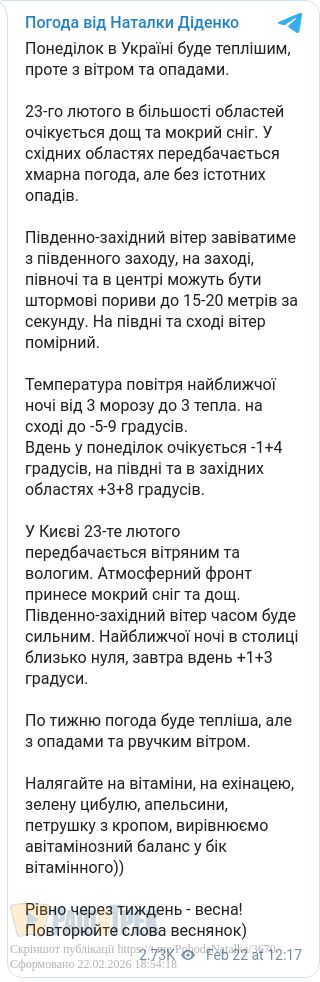 Завтра, 23 лютого, в Україні буде тепліше, проте з вітром та опадами, повідомила синоптик Наталка Діденко.