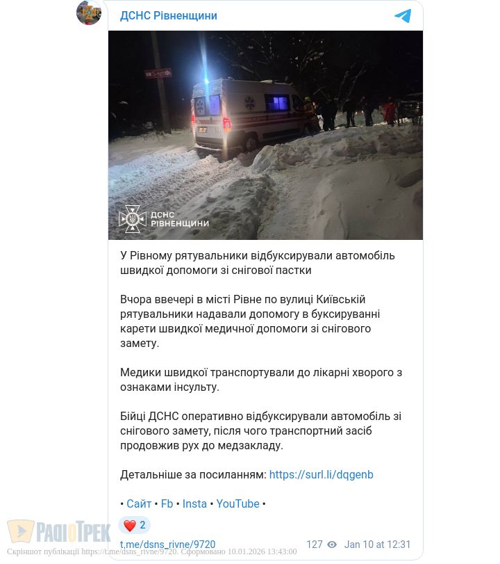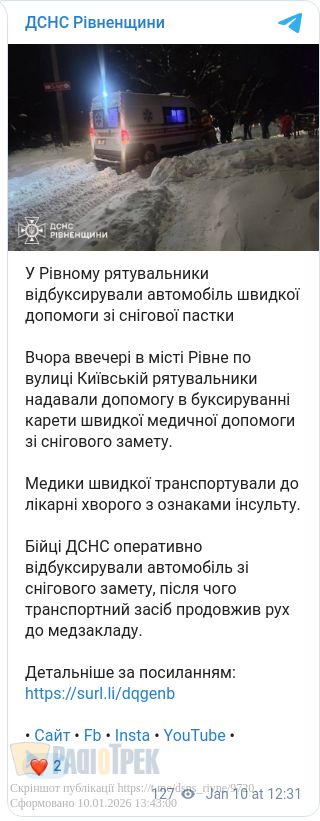 Бійці ДСНС оперативно виштовхали автомобіль зі снігової пастки, після чого швидка змогла продовжити рух до медзакладу.