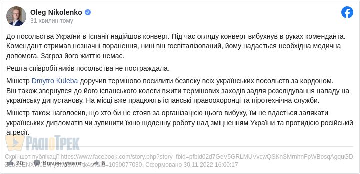 Співробітник посольства України в Мадриді отримав легкі поранення внаслідок вибуху пристрою в дипломатичній делегації та був евакуйований до столичного госпіталю, - повідомляє іспанське видання Ultima Hora.