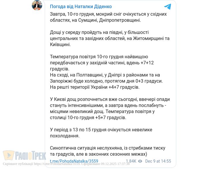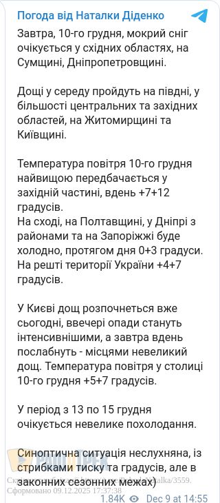 Завтра, 10 грудня, у східних областях, на Сумщині та Дніпропетровщині очікується мокрий сніг. А ось на Півдні, у Центрі, на Житомирщині, Київщині та на Заході пройдуть дощі, повідомила синоптик Наталка Діденко.