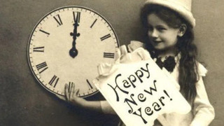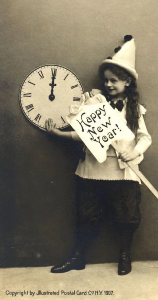 - Маленька дівчинка в костюмі арлекіна з годинником, що показує північ, і табличкою «З Новим роком!», 1907 рік.