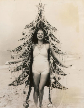 - Дівчина в купальнику та накидці у вигляді ялинки на пляжі в Каліфорнії, близько 1930 року.