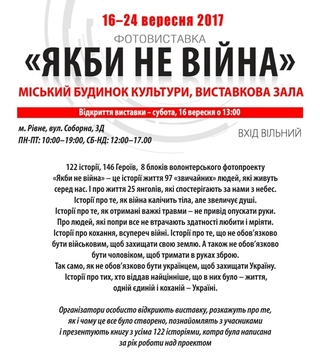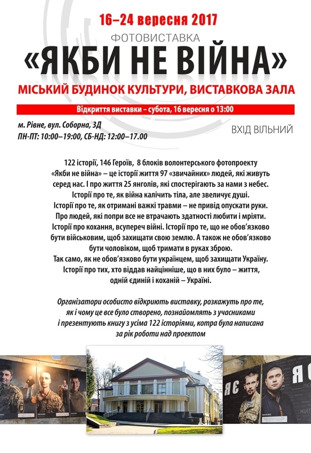 16 вересня – відкриття волонтерського фотопроекту «Якби не війна». Виставкова зала. Початок о 13:00 год.