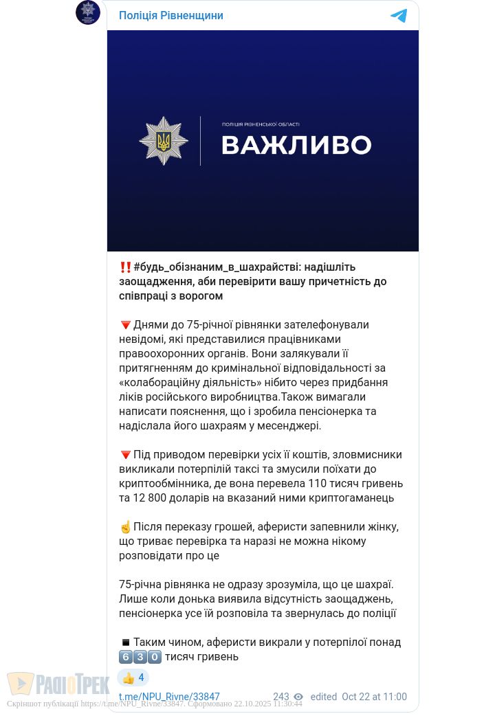 Віддала шахраям понад пів мільйона гривень: пенсіонерку з Рівненщини ошукали «правоохоронці»