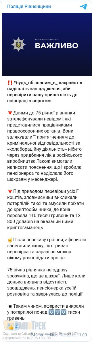 Днями 75-річній жінці зателефонували псевдоправоохоронці й переконали, що вона нібито причетна до колаборації через купівлю ліків російського виробництва.