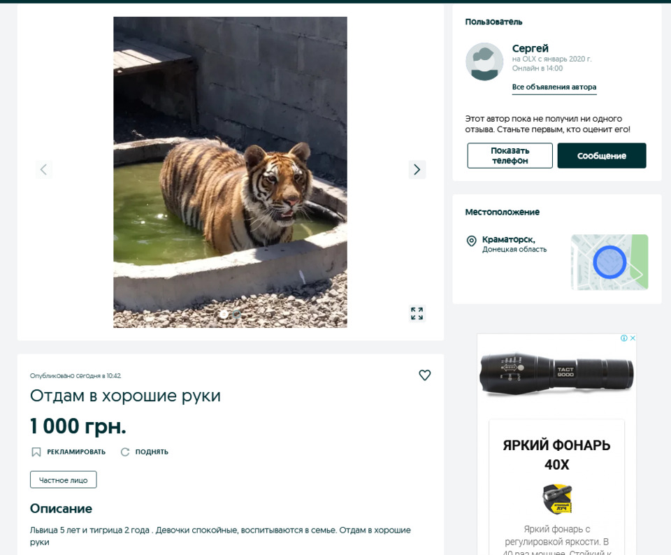 На сайті оголошень olx.ua мешканець Краматорська, що на Донеччині, за символічну плату в 1000 гривень обіцяє «віддати в добрі руки» тигрицю та левицю.