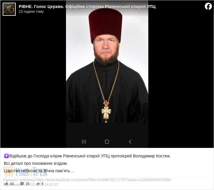 Відійшов до Господа клірик Рівненської єпархії УПЦ протоієрей Володимир Костюк. Царство небесне та Вічна памʼять… – йдеться у повідомленні.