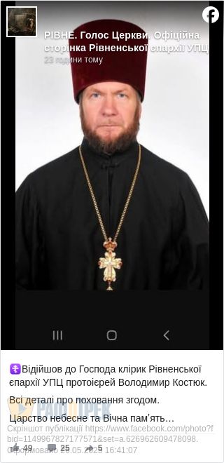 У засвіти відійшов клірик Рівненської єпархії УПЦ протоієрей Володимир Костюк.