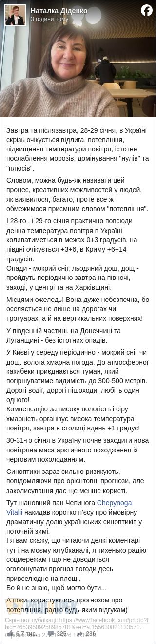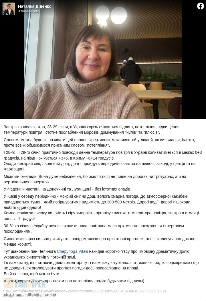28-29 січня в Україні очікується відлига, повідомила синоптик Наталка Діденко.