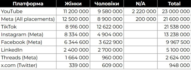 - На початок року YouTube залишається лідером ринку, з невеликим зростанням жіночої аудиторії на 0,7 млн користувачів. TikTok посідає друге місце з охопленням 21,5 млн користувачів та є єдиною платформою, де переважає чоловіча аудиторія.
