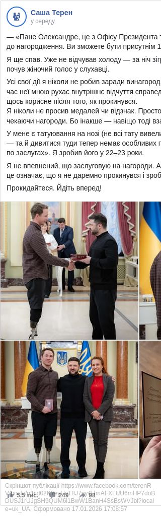 Нагадаємо, у 2022 році Терен вступив до лав добровольчого батальйону Карпатська Січ. Отримав поранення під час боїв у Харківській області на Ізюмському напрямку, внаслідок чого втратив обидві ноги. Того ж року він презентував свою першу книгу Історія впертого чоловіка.