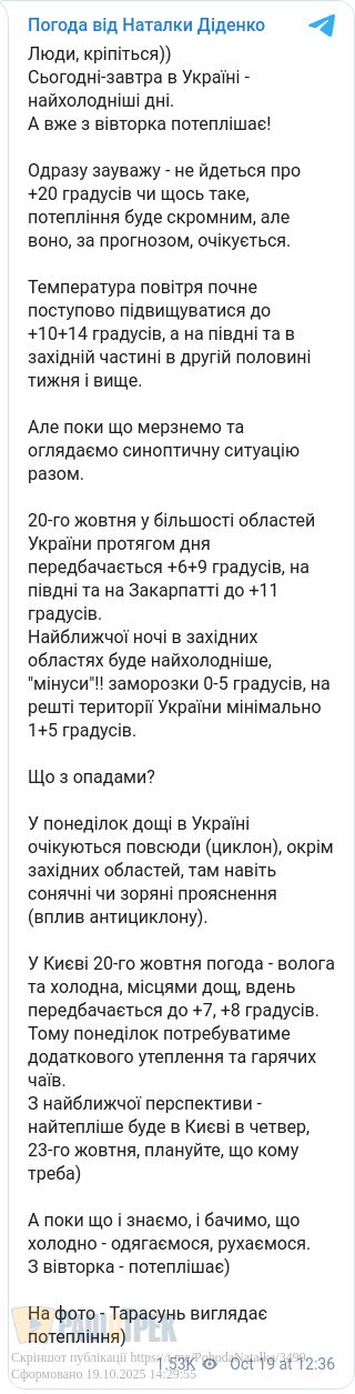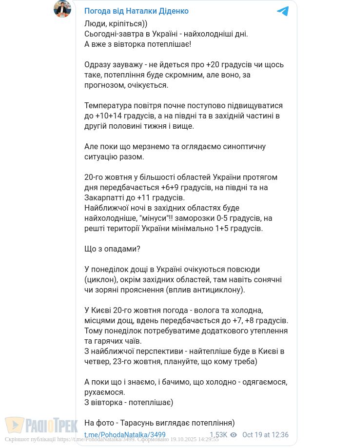 У вівторок 21 жовтня в Україні очікується потепління. Про це повідомила синоптик Наталка Діденко.