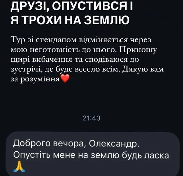 - Друзі, опустився і я трохи на землю. Тур зі стендапом скасовується через мою неготовність до нього. Приношу щирі вибачення та сподіваюся до зустрічі, де буде весело всім. Дякую вам за розуміння».