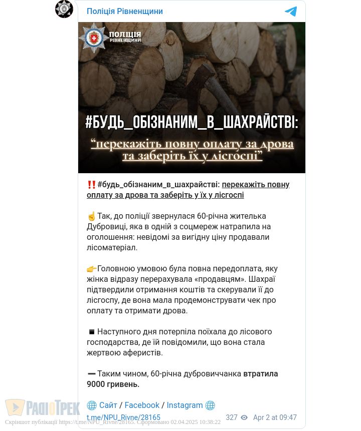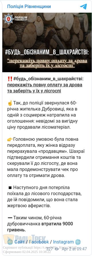 Шахраї ошукали жительку Рівненщини на 9 тисяч гривень. 60-річна жінка у соціальній мережі натрапила на оголошення про продаж дров за вигідною ціною.