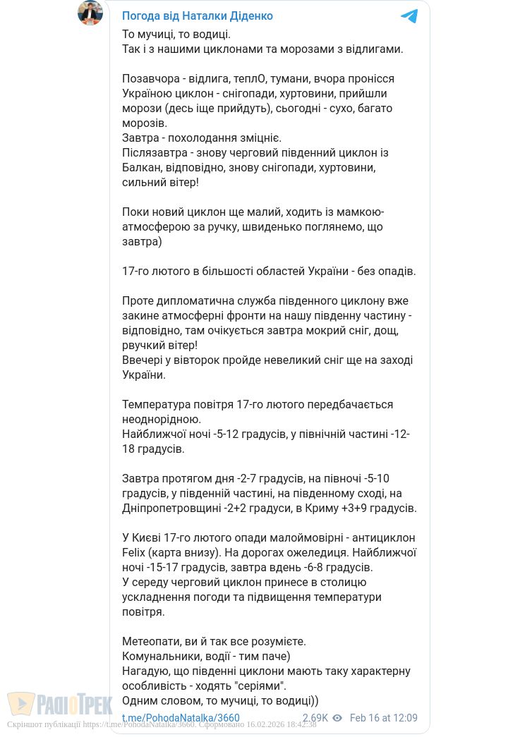 Завтра протягом дня буде -2...-7 градусів, на Півночі – до -5...-10 градусів, у південній частині, на південному сході, а також на Дніпропетровщині буде до -2...+2 градусів, в Криму очікується до +3...+9 градусів.