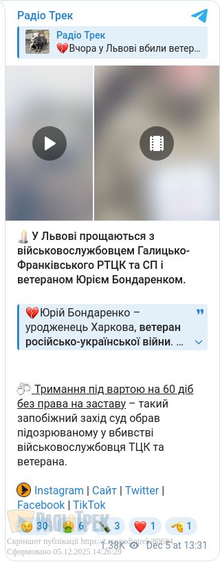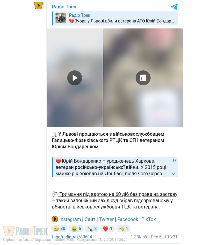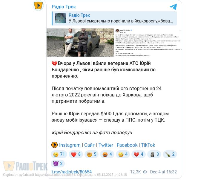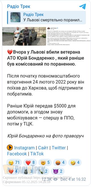 Чоловік, який днями у Львові вбив ветерана і працівника ТЦК Юрія Бондаренка, виявився родом з Рівненщини. Підозрюваний 30-річний Григорій Кедрук у суді пояснив, що не пам’ятає, як завдав військовому смертельного удару ножем.