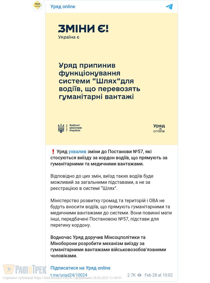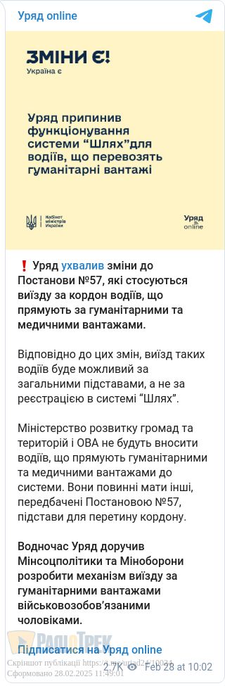 25 лютого Кабмін схвалив зміни до постанови №57, що стосуються виїзду за кордон водіїв, що прямують за гуманітарними та медичними вантажами. Відповідно до цих змін, виїзд таких водіїв буде можливий за загальними підставами, а не за реєстрацією в системі «Шлях».