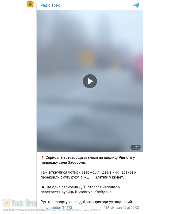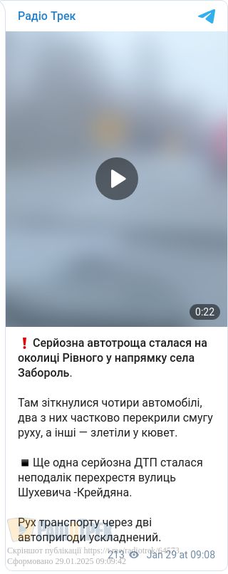 Автопригода сталася сьогодні, 29 січня, близько 08:30 на трасі «Городище-Рівне-Старокостянтинів» неподалік села Олександрія.