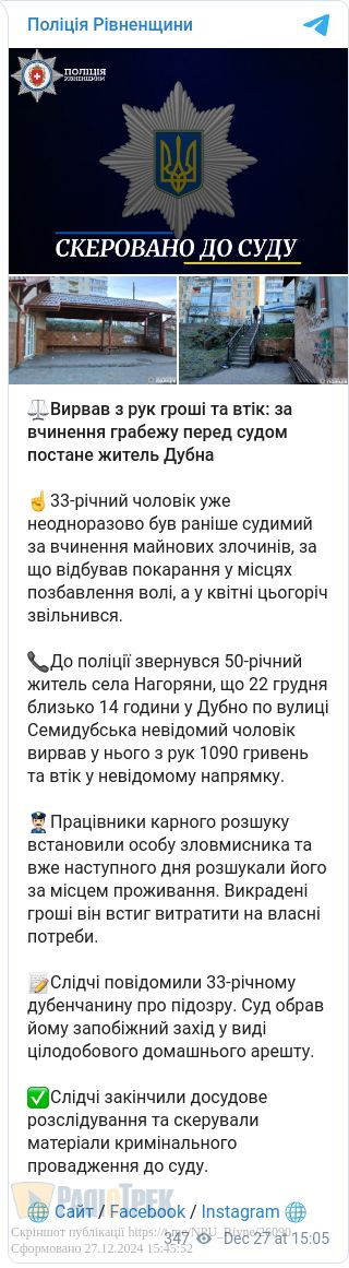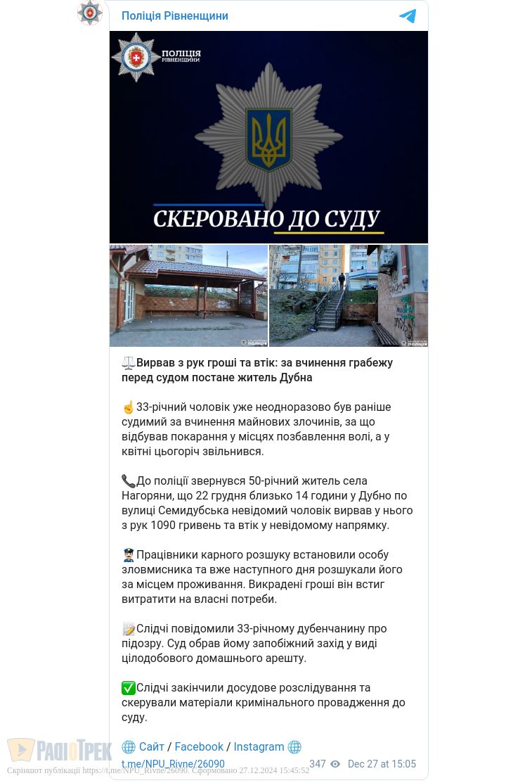 Житель Дубна постане перед судом за крадіжку коштів. Інцидент стався днями, на вулиці Семидубській.