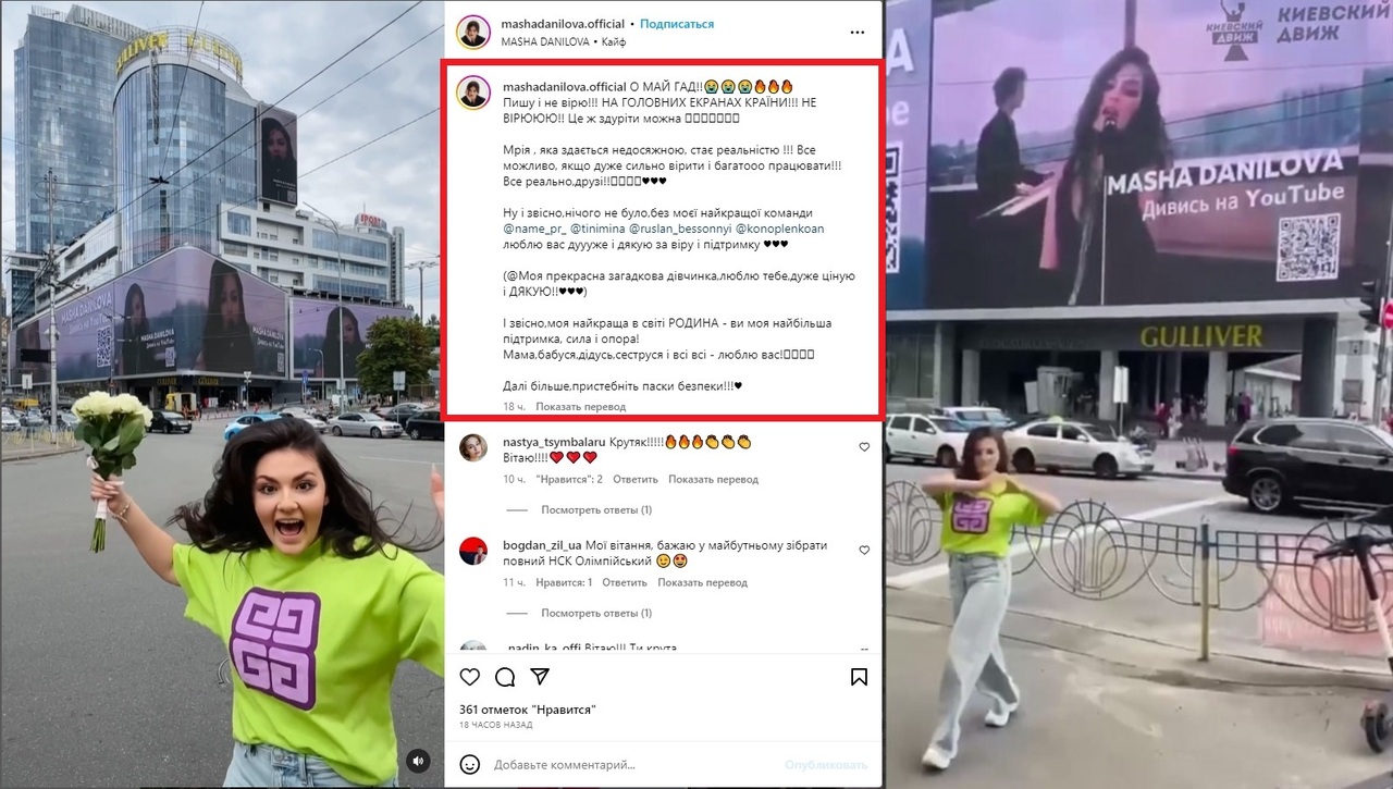 «О МАЙ ГАД!!...Пишу і не вірю. На головних екранах країни. Не вірю! Це ж з глузду з'їхати можна. Мрія, яка здається недосяжною, стала реальністю! Все можливо, якщо дуже сильно вірити і багато працювати! Все реально, друзі», — підписала Маша відео. На записі видно, що разом зі співачкою біля «Гулівера», де крутять рекламу її кліпу, стоїть знімальна група. Радісна Маша з величезним букетом квітів танцює під свою пісню.