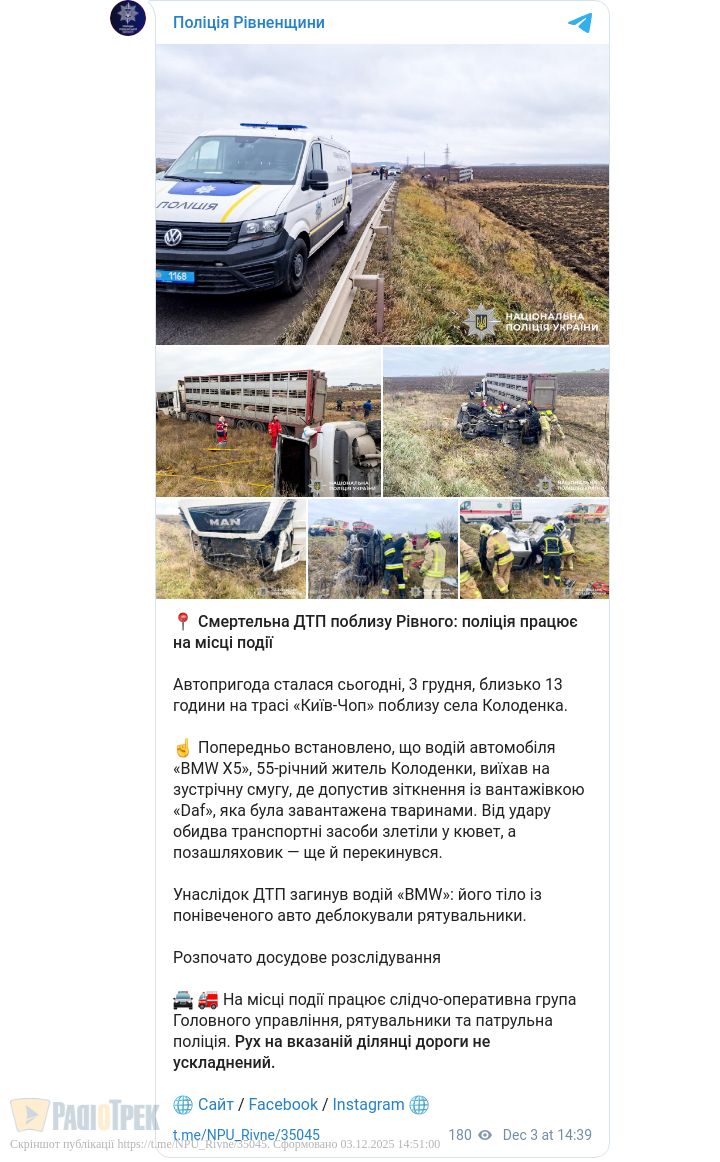 Смертельна ДТП сталася дві години тому поблизу Рівного на трасі Київ-Чоп біля села Колоденка (це на об'їзній м. Рівне).