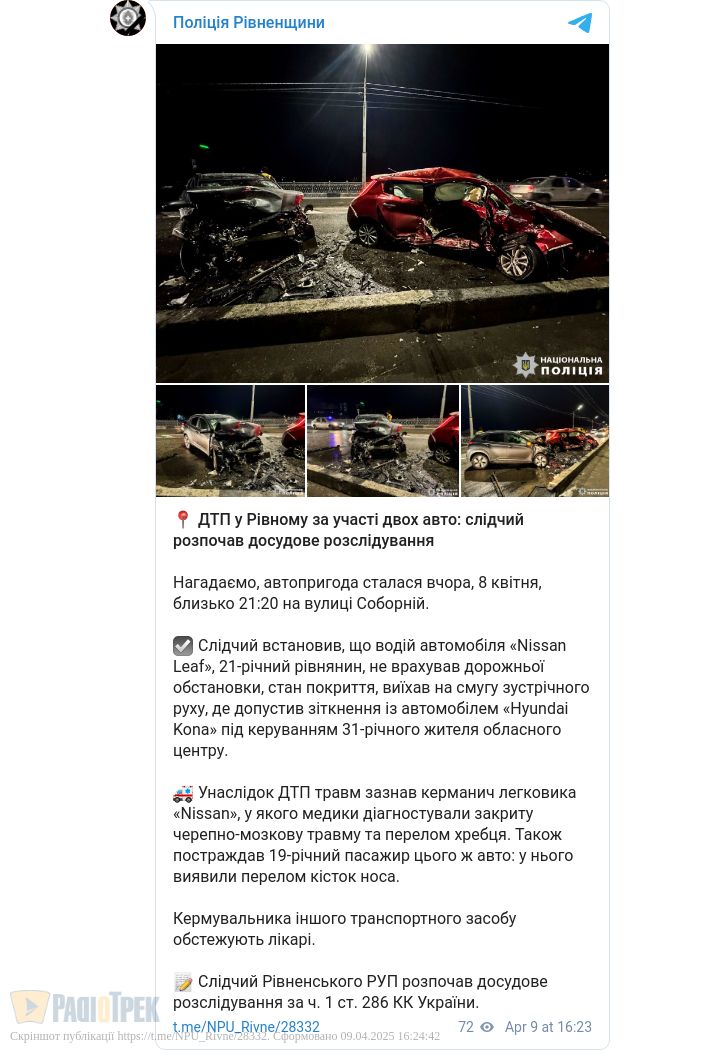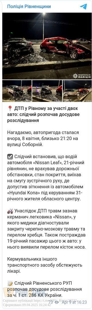 Слідчий встановив, що 21-річний водій автомобіля Nissan Leaf не врахував дорожньої обстановки, стан покриття, виїхав на смугу зустрічного руху, де зіткнувся з автомобілем «Hyundai Kona, яким керував 31-річний рівнянин.