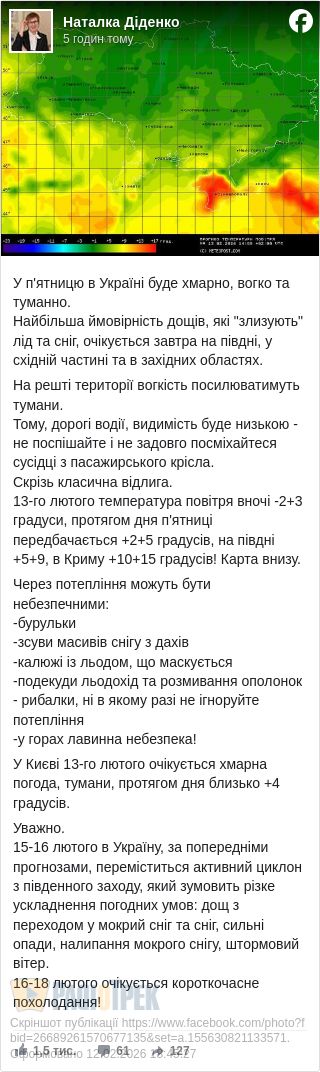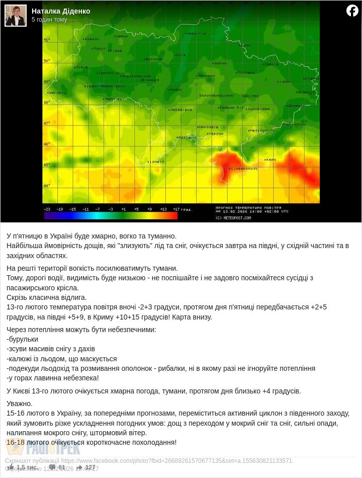 Завтра, 13 лютого, в Україні буде хмарно, вогко та туманно. Найбільша ймовірність дощів буде на Півдні, у східній частині та в західних областях. На решті території вогкість посилюватимуть тумани, повідомила синоптик Наталка Діденко.