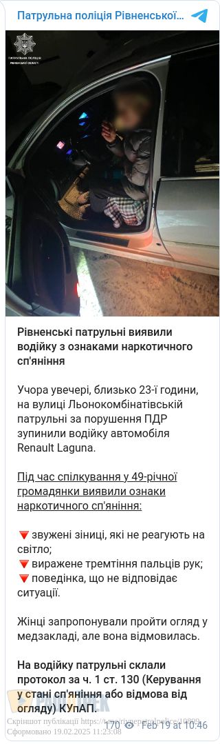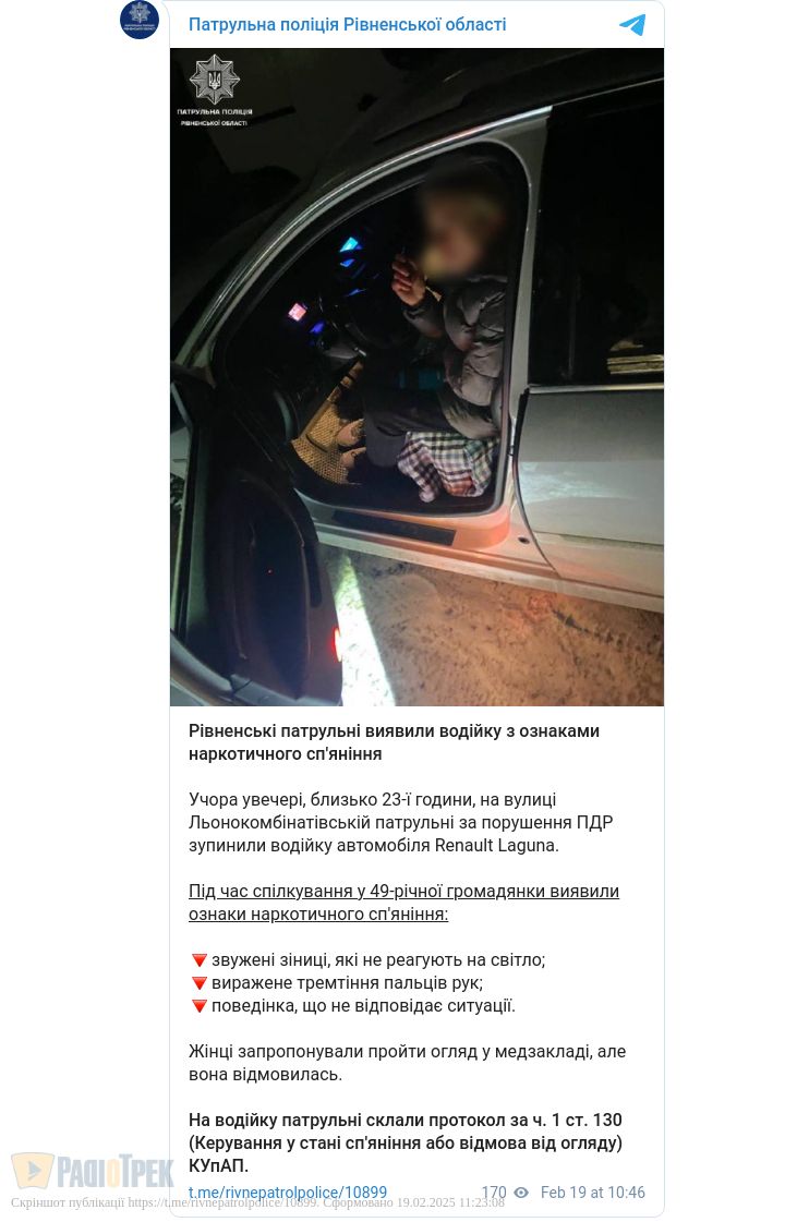 Водійку під наркотиками затримали патрульні у Рівному. Вчора вечері, на вулиці Льонокомбінатівській, правоохоронці помітили, як водійка Renault Laguna порушувала правила дорожнього руху.
