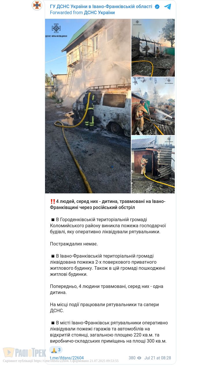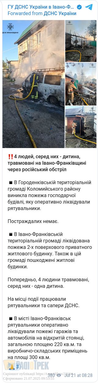 За даними ДСНС в Івано-Франківській області, через російський обстріл травми отримали 4 людей, серед них – дитина.