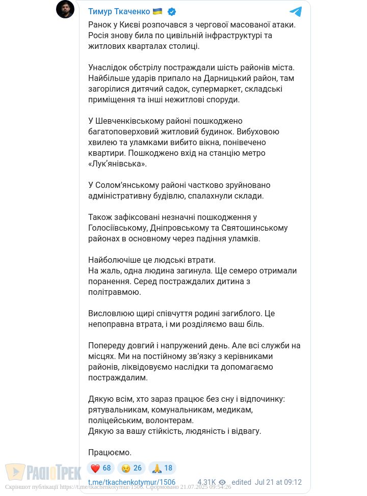 Очільник Київської МВА Тимур Ткаченко зазначив: