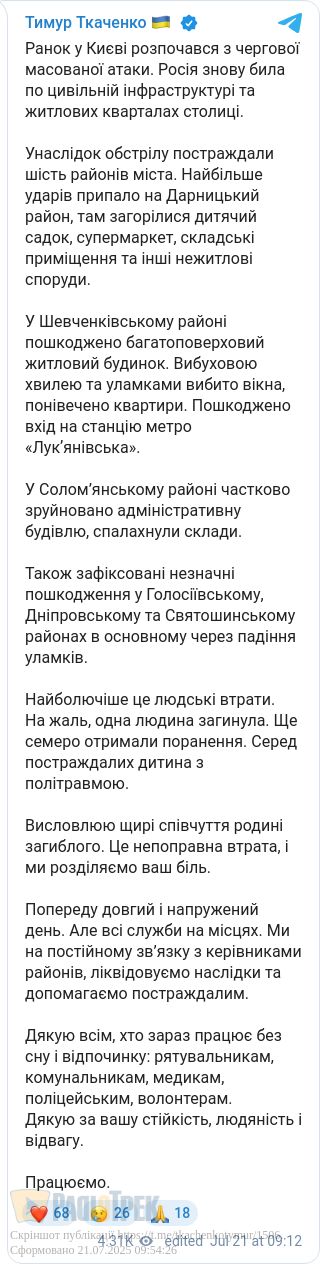 На жаль, одна людина загинула. Ще семеро отримали поранення. Серед постраждалих дитина з політравмою.
