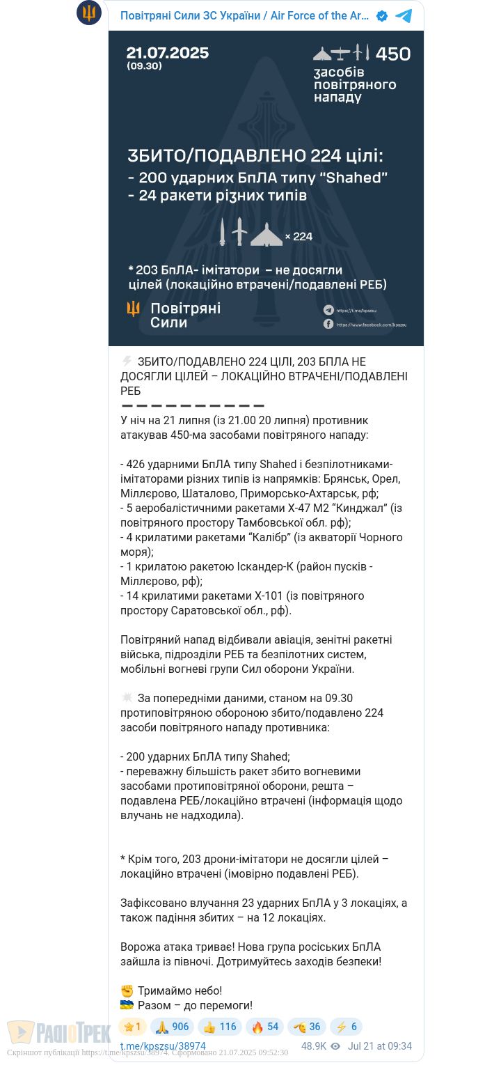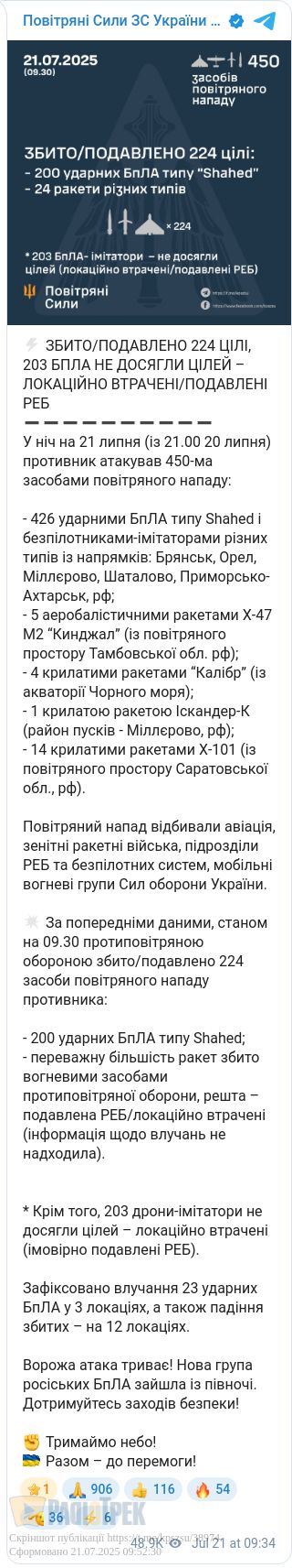 До слова, за ніч рф атакувала Україну 450-ма засобами повітряного нападу, 224 з них, за попередніми даними, знешкодила ППО.