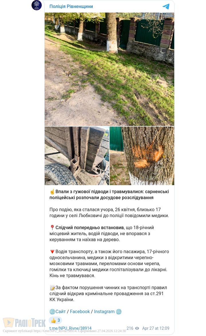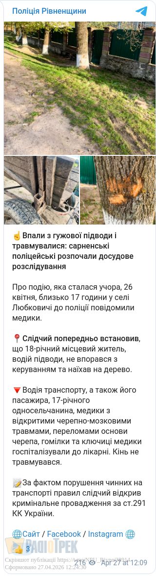 Впали з воза і ледь не загинули: деталі аварії на Сарненщині (ФОТО)