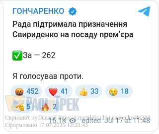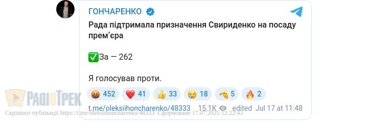 «За» проголосували 262 депутати. Про це повідомив нардеп Олексій Гончаренко.