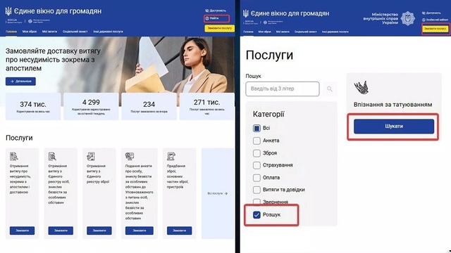 Щоб скористатися можливостями розділу, необхідно зайти на портал «Єдине вікно для громадян», перейти до переліку послуг та обрати «Розшук», після чого відкрити розділ «Впізнання за татуюванням».