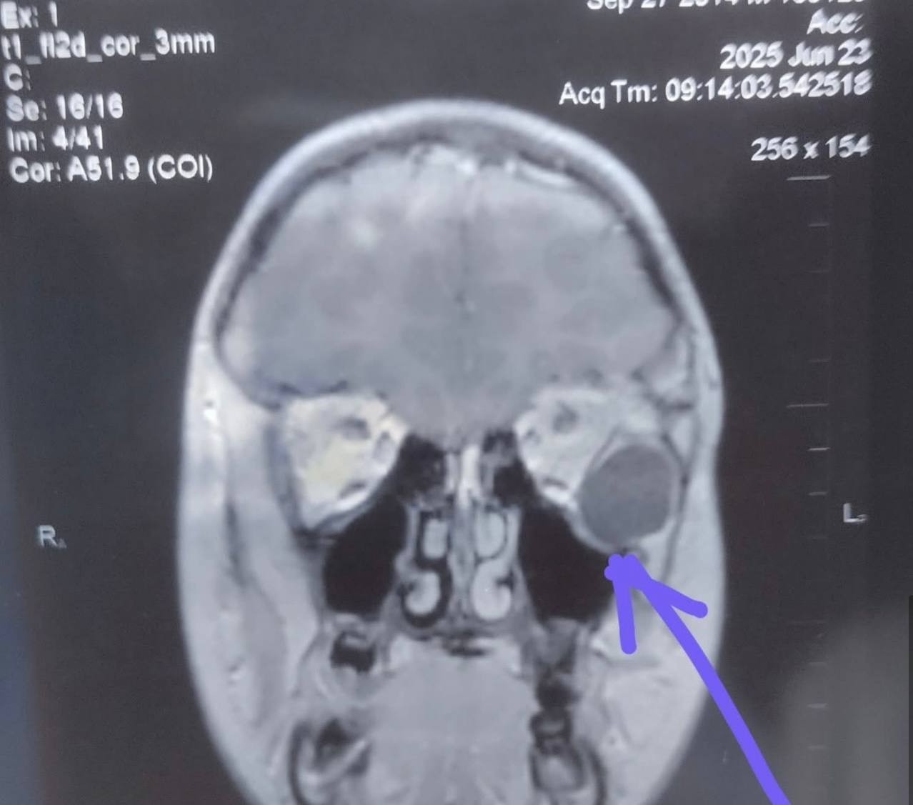Після проведення МРТ обстеження виявили новоутвір великих розмірів (приблизно 20 мм), який зміщував очне яблуко та викликав у дитини наявні симптоми.