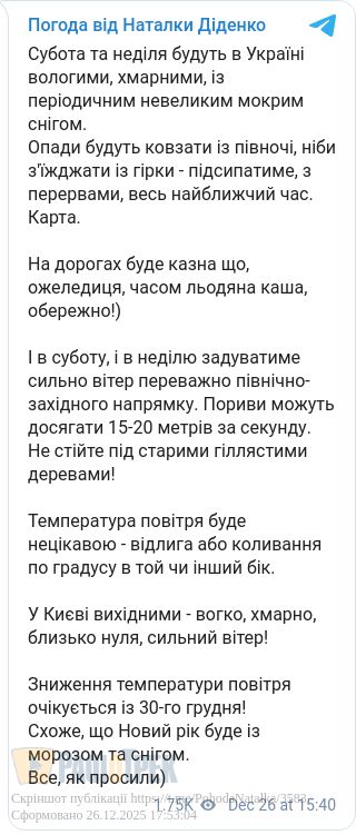 Субота та неділя будуть хмарними та із періодичним мокрим снігом, повідомила синоптик Наталка Діденко.