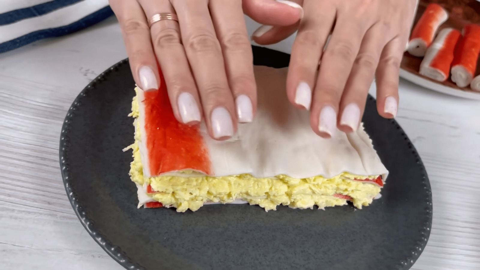 Крабові палички оберіть ті, що легко розгортаються. Розгорніть паличку, намастіть сирною масою і накрийте наступною, червоною стороною догори. Повторюйте, доки не закінчаться інгредієнти.