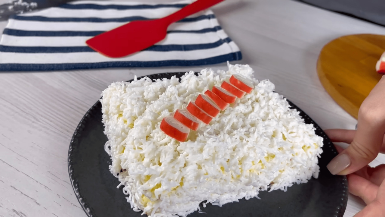 Готовий салат зверху й з боків посипте тертим білком. За бажанням прикрасьте шматочками крабових паличок. Салат виходить ніжний, акуратний і виглядає дуже апетитно.