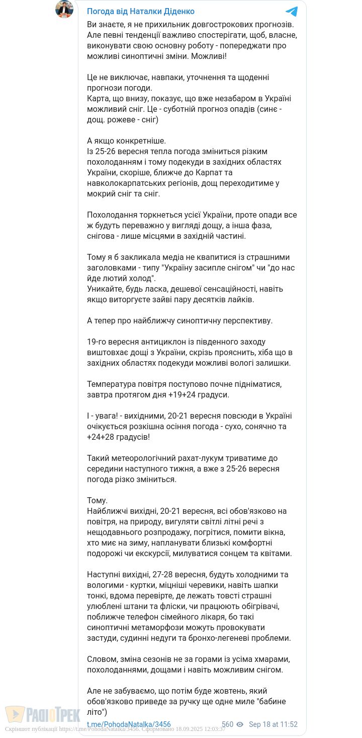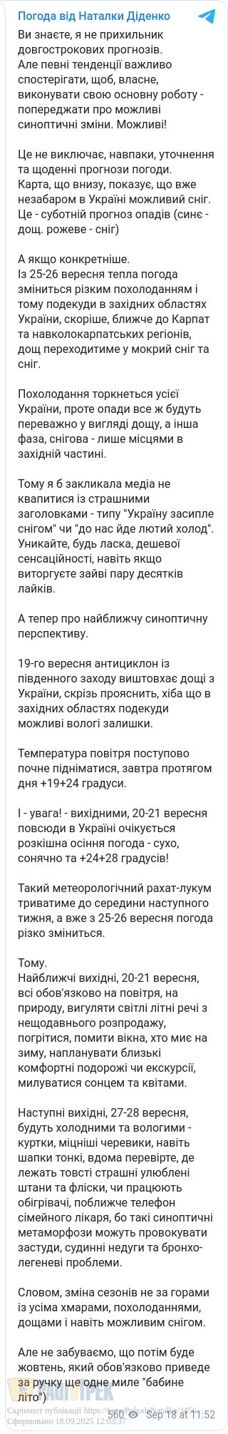 Поступове похолодання почнеться з 25 вересня, а 27–28 вересня очікується холод і дощі.