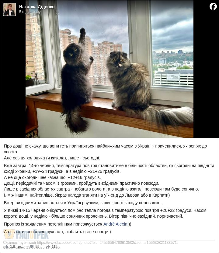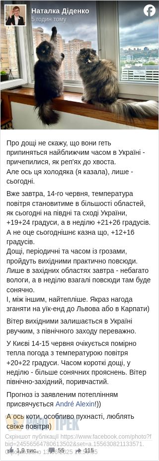 Завтра, 14 червня, в більшості областей України буде тепло. Про це повідомила синоптик Наталка Діденко.