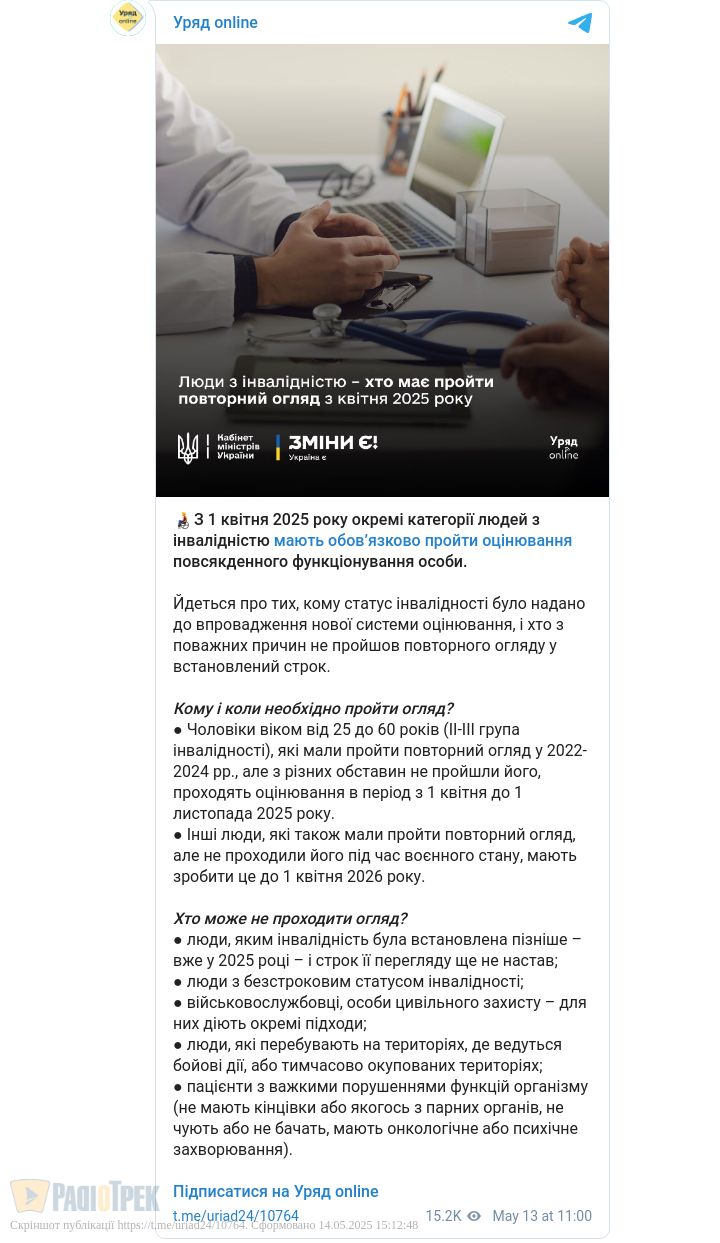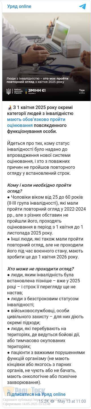 - Чоловіки віком від 25 до 60 років (ІІ-ІІІ група інвалідності), які мали пройти повторний огляд у 2022-2024 рр., але з різних обставин не пройшли його, проходять оцінювання в період з 1 квітня до 1 листопада 2025 року.