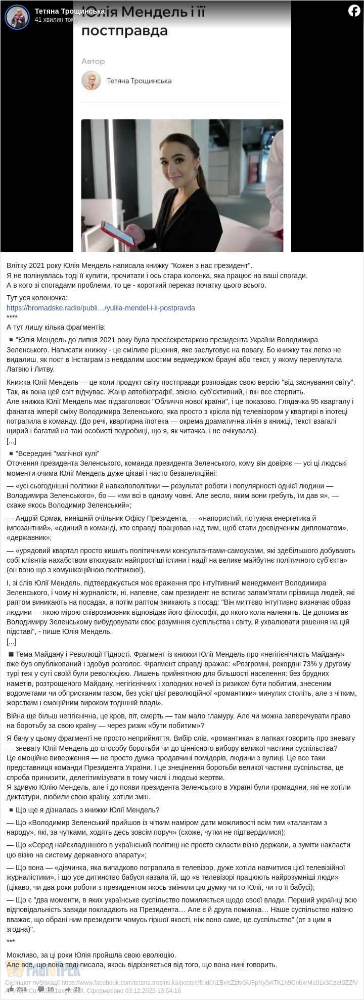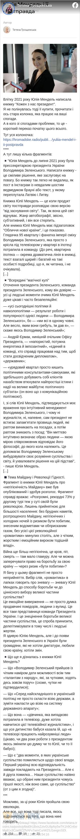 - Після звільнення з ОП, улітку 2021 р. Юлія Мендель видала книгу «Кожен із нас президент»