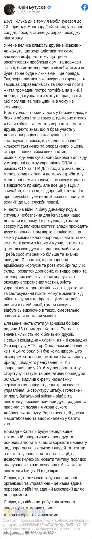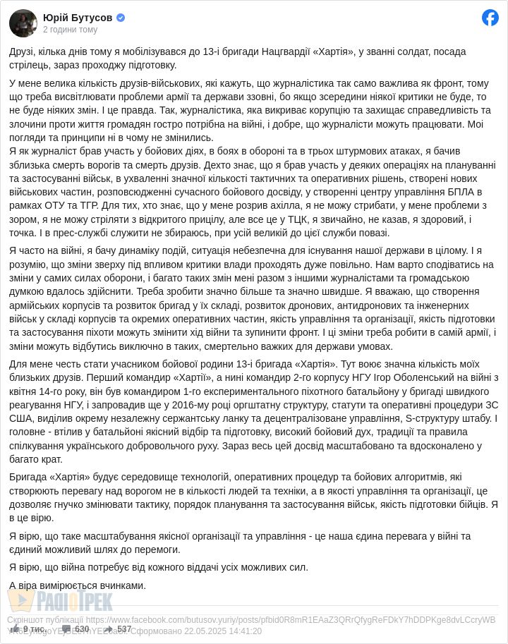 Друзі, кілька днів тому я мобілізувався до 13-і бригади Нацгвардії «Хартія», у званні солдат, посада стрілець, зараз проходжу підготовку.