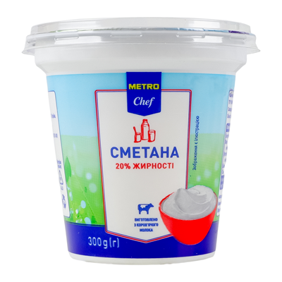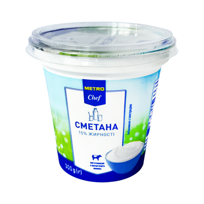 - Сметана середньої жирності (15–20%). Це універсальний варіант. Саме таку сметану в METRO найчастіше купують для повсякденного використання – до борщу, дерунів чи вареників.
